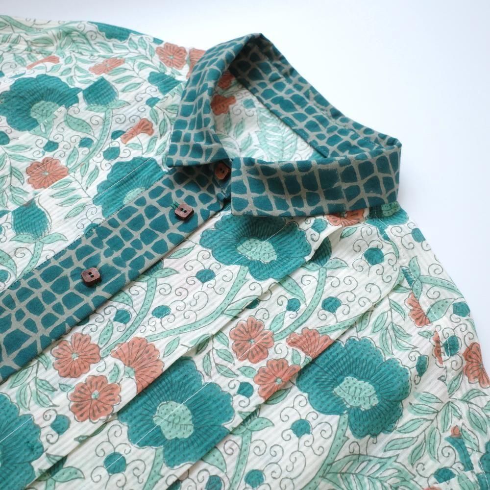 特徴 どことなくレトロ感漂う見事な構図の柄。白地に、グリーンとの花柄がよく映えます。さらっと気持ちのよいドビー織で、ストライプの織り柄があります。