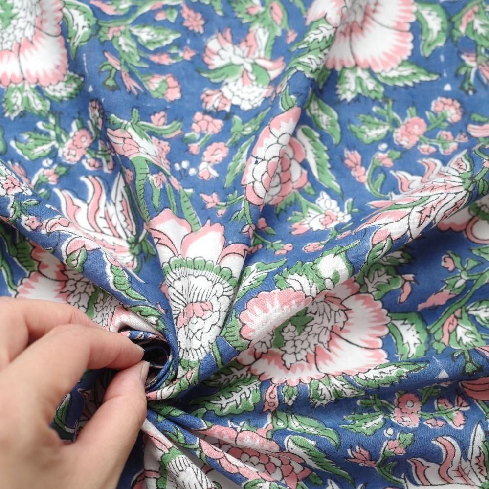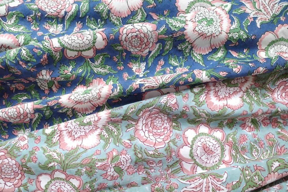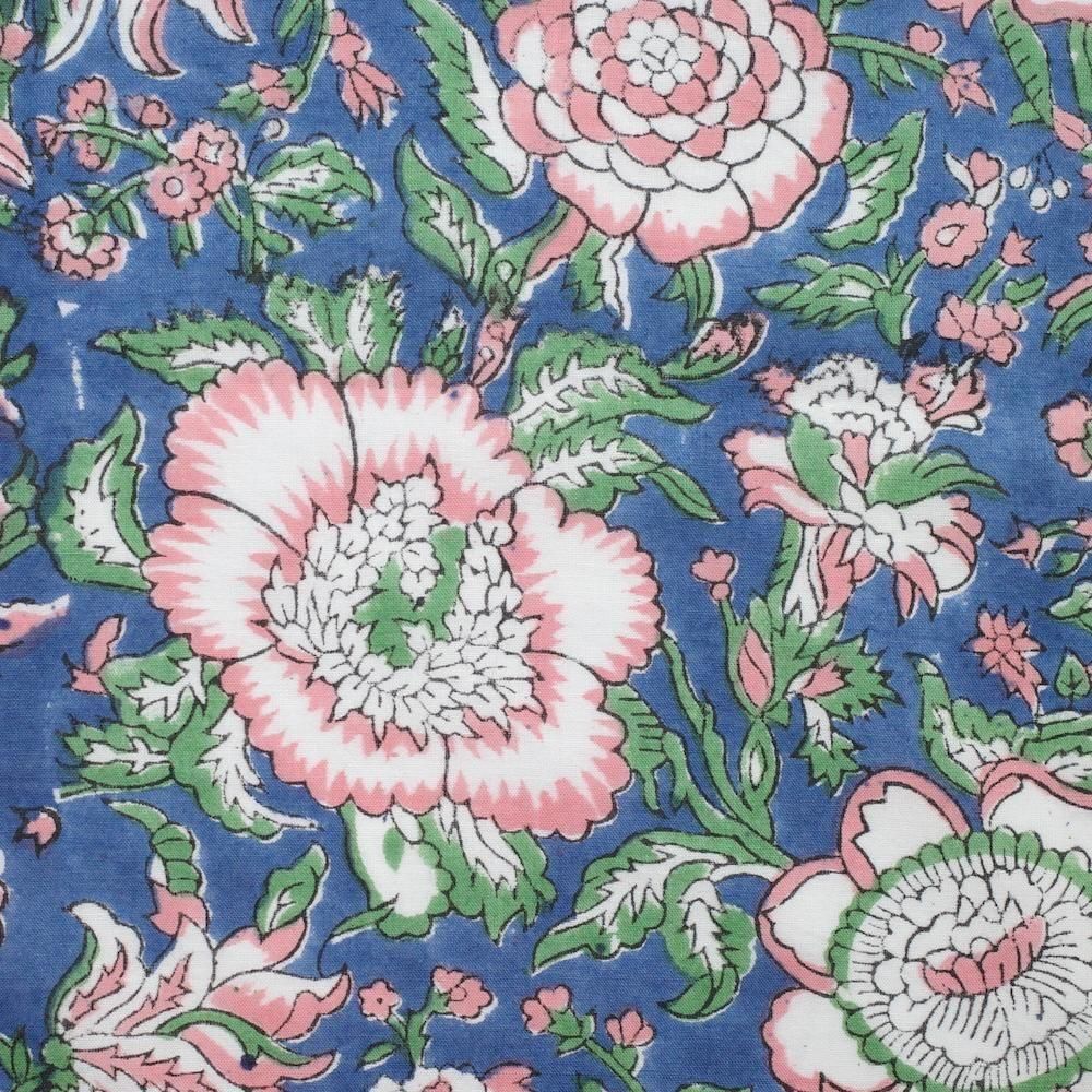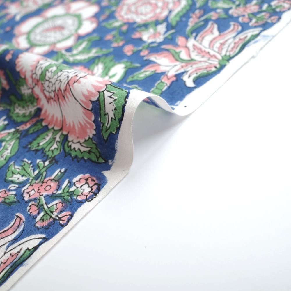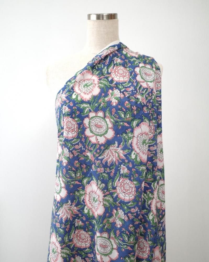 特徴 華やかな構図の花柄。深みのあるブルー×ベビーピンク。