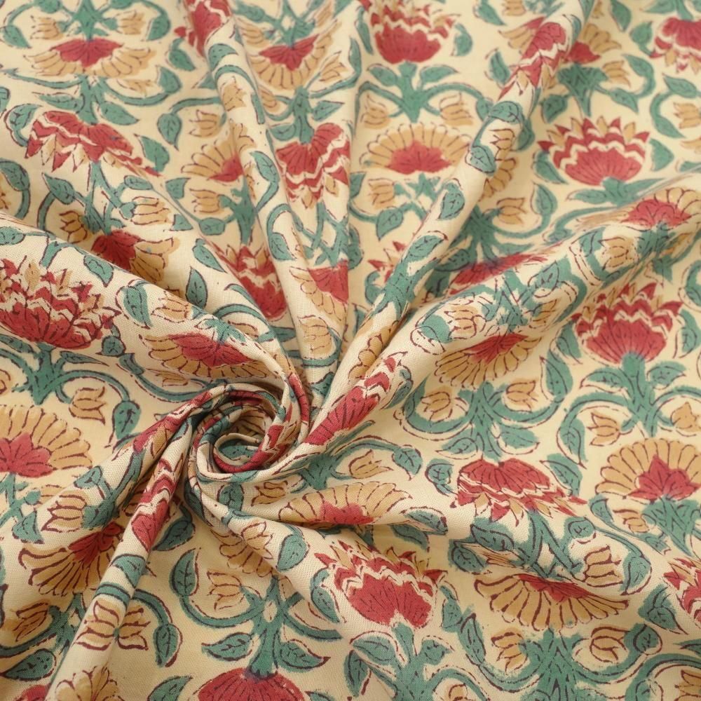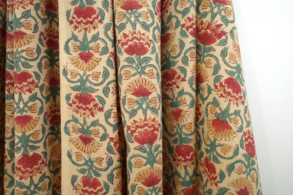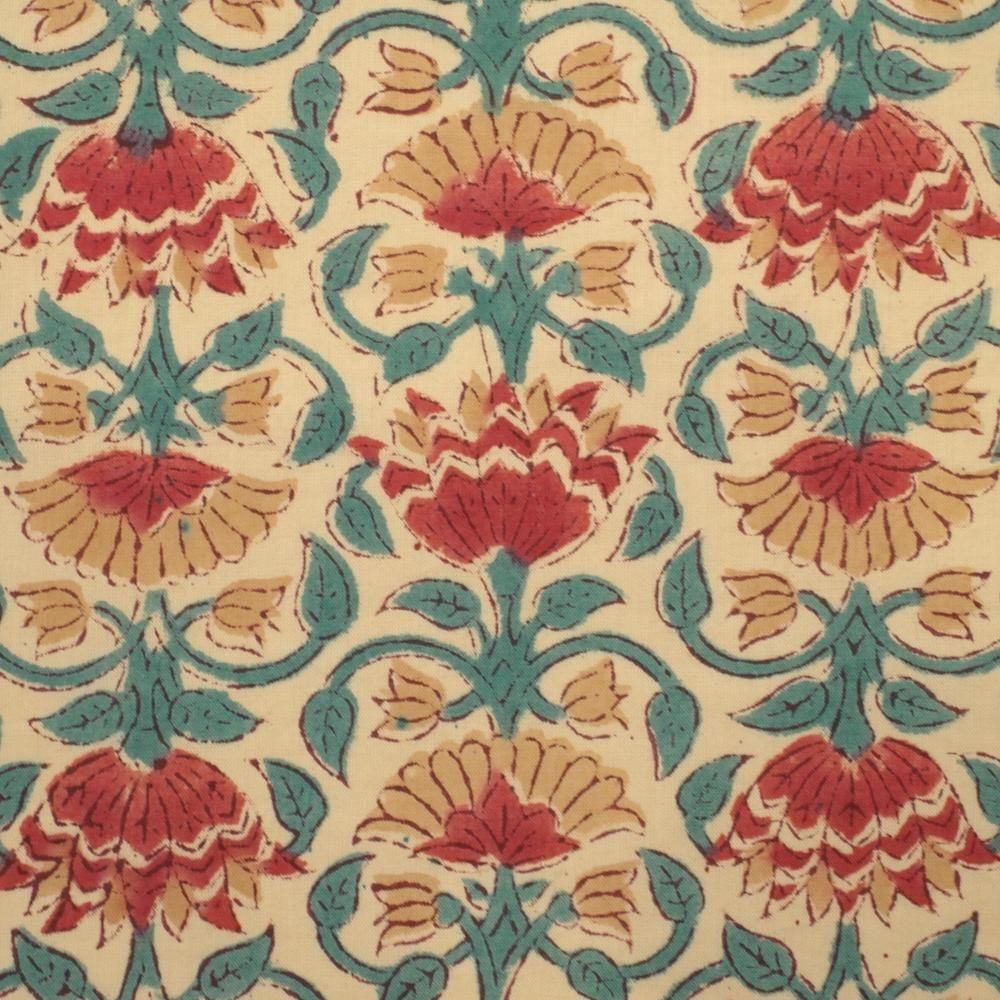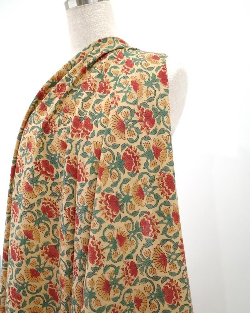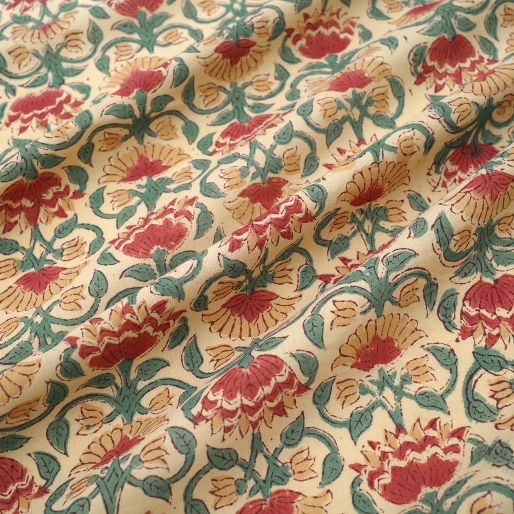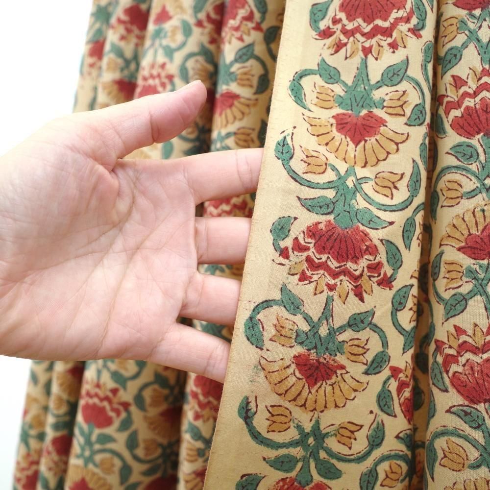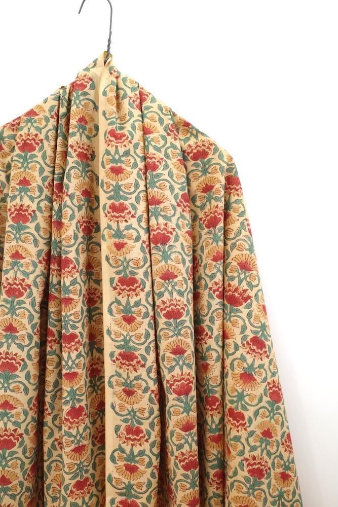 特徴 レトロ感漂う個性的な花柄。イエローベージュの地色&ブリックレッドの花。